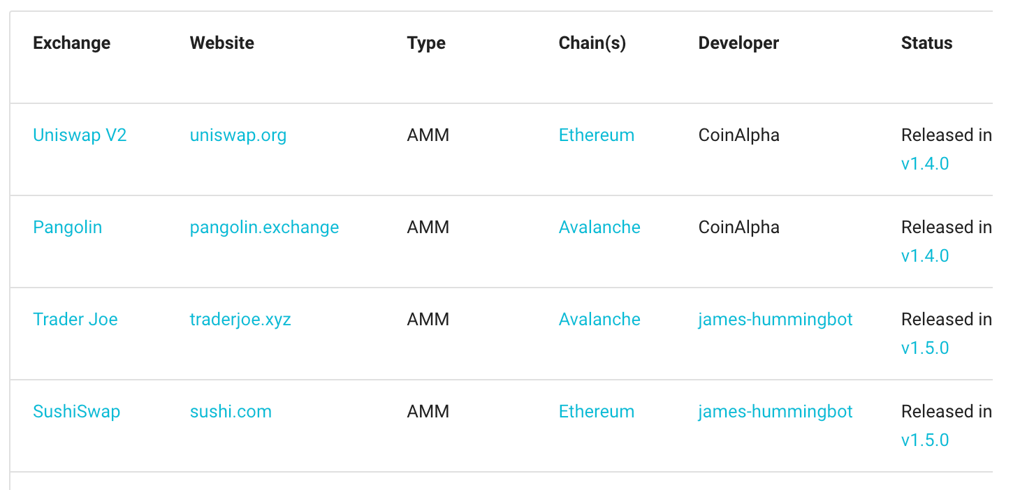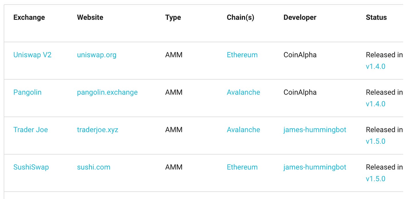 We are very excited to ship theย June 2022 Hummingbot release (v1.5.0)ย today! This release adds a number of new exchange connectors, such as Bybit spot and CoinFLEX perpetual, along with new DEX connectors for TraderJoe and SushiSwap. In addition, the Gate.io, OKX, and Bitmart connectors have been updated to the latest connector standards,
